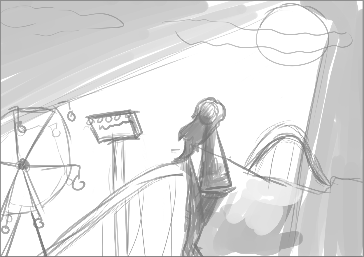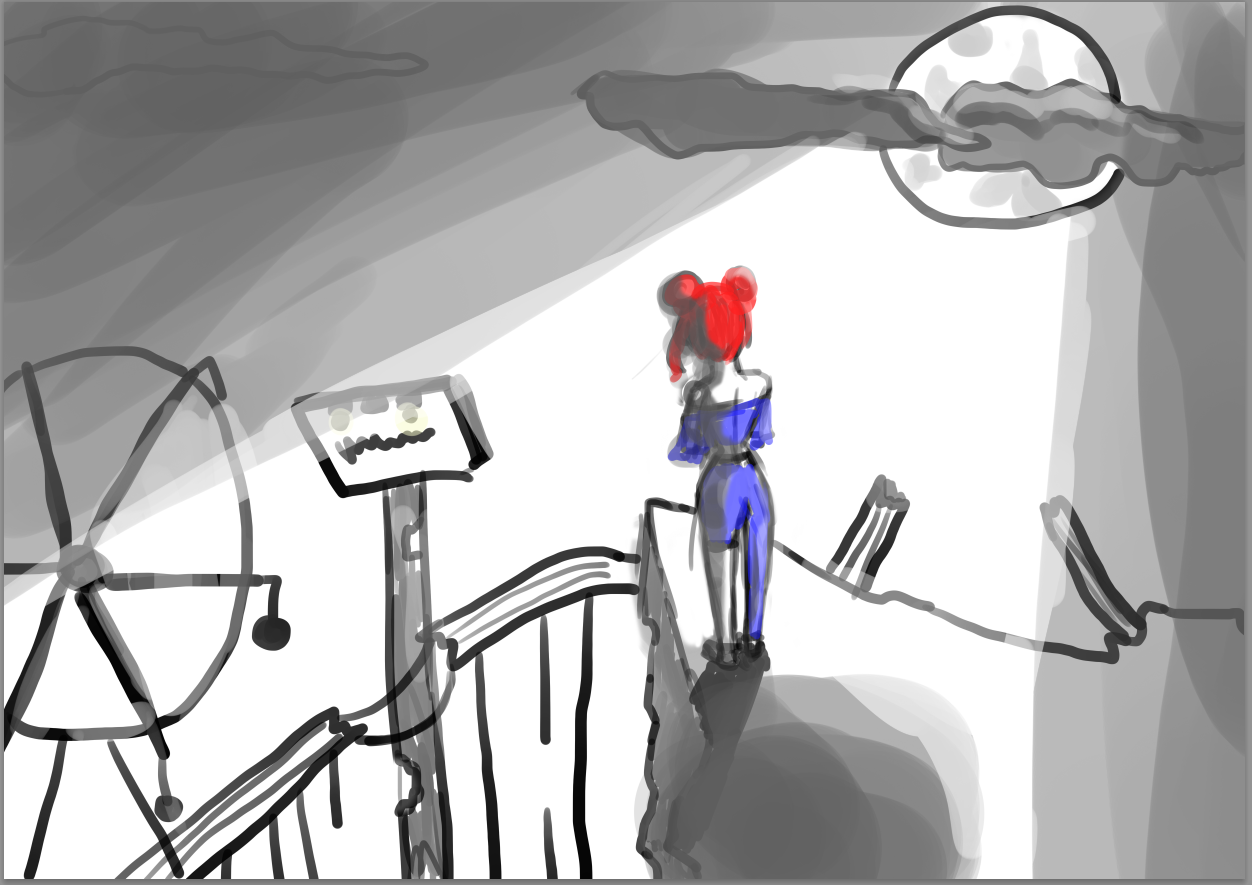 Für die Ideenfindung habe ich eine düstere und geheimnisvolle Atmosphäre gewählt, die gut zur Spielwelt von GANDAN CITY passt. Der Vergnügungspark dient als zentrales Motiv, wirkt jedoch in der Nacht unheimlich und bedrohlich. Mondlicht soll dabei für spannende Kontraste sorgen und gleichzeitig einen Hauch von Hoffnung vermitteln.