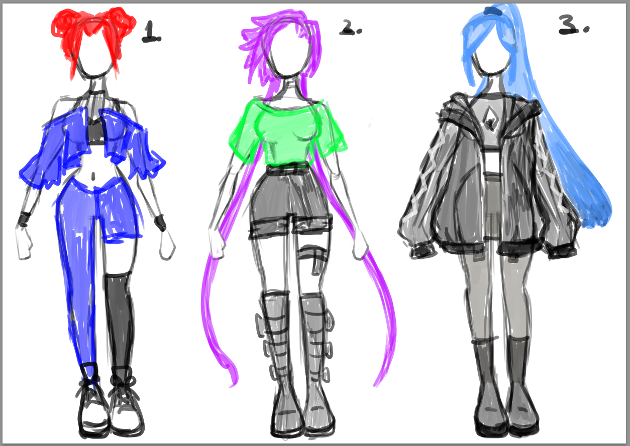 Charakter Zeichnung: Ich habe mich anfangs für Nummer eins entschieden wie man bei Sketch 2 sieht aber am ende für die Nummer drei entschieden.